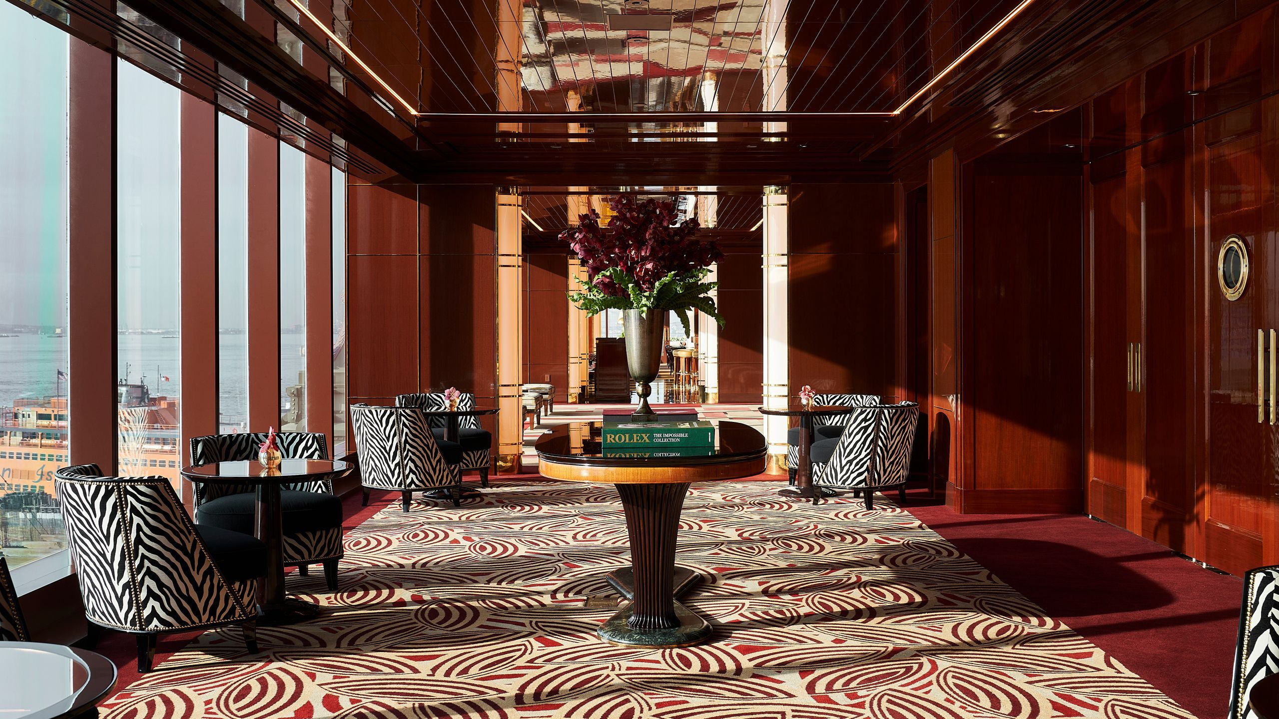 Guests are welcomed into an atmosphere reminiscent of a grand European residence. The building, formerly known as the Battery Maritime Building, is a historic landmark meticulously restored to preserve its architectural charm. The interior exudes calmness and refinement—deep mahogany wood tones, cream fabrics, and views that frame the harbor like living paintings.