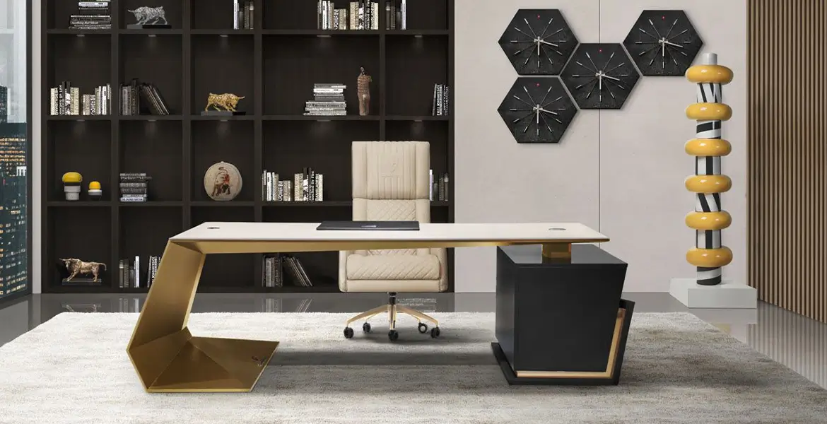 This executive desk features a natural marble top combined with a sturdy metal base, exuding sophistication and authority. It’s designed for CEOs, directors, and managers who need a durable yet elegant centerpiece in their workspace.