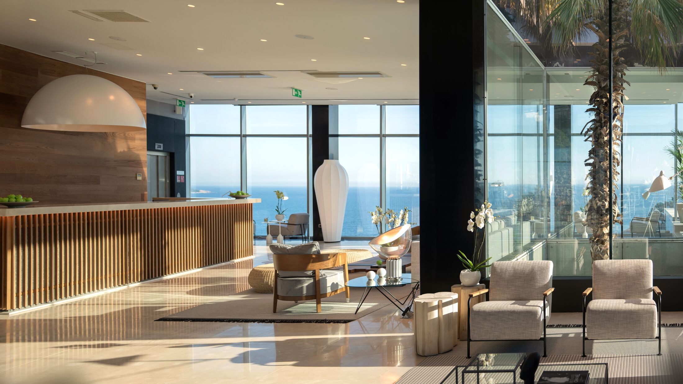 Each room is crafted to reflect natural beauty, featuring floor-to-ceiling glass, neutral tones, and luxury amenities. The hotel includes the renowned Vapor Restaurant, which serves gourmet Mediterranean cuisine made with locally sourced ingredients, and a full-service wellness spa offering Thalassotherapy and aromatherapy treatments.
